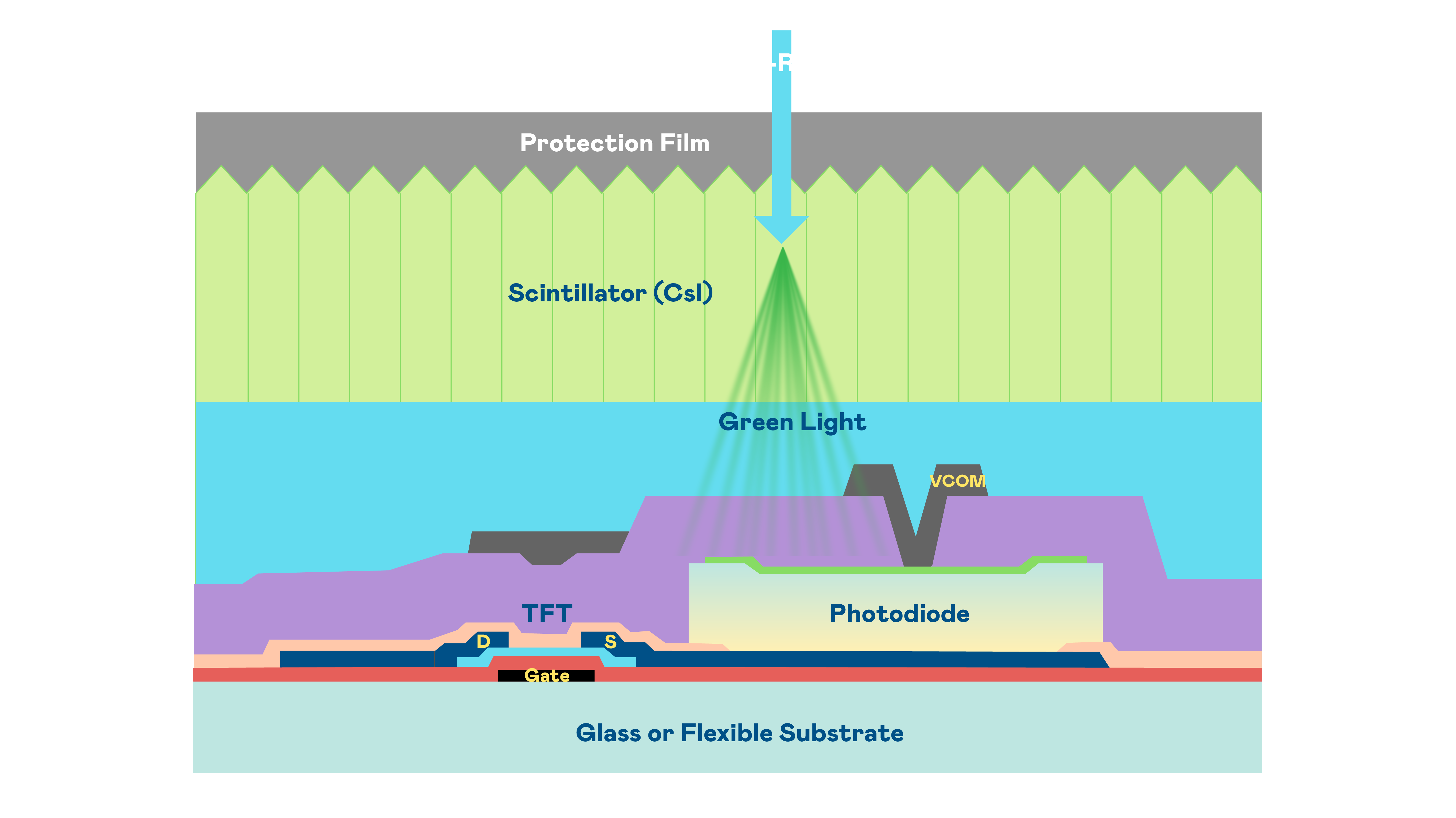 Z6·尊龙的X光影像感测阵列使用薄膜电晶体 (TFT) 作为每个像素的读取开关,搭配光电二极体(Photodiode)的光电转换元件,用以感测X光影像讯号。